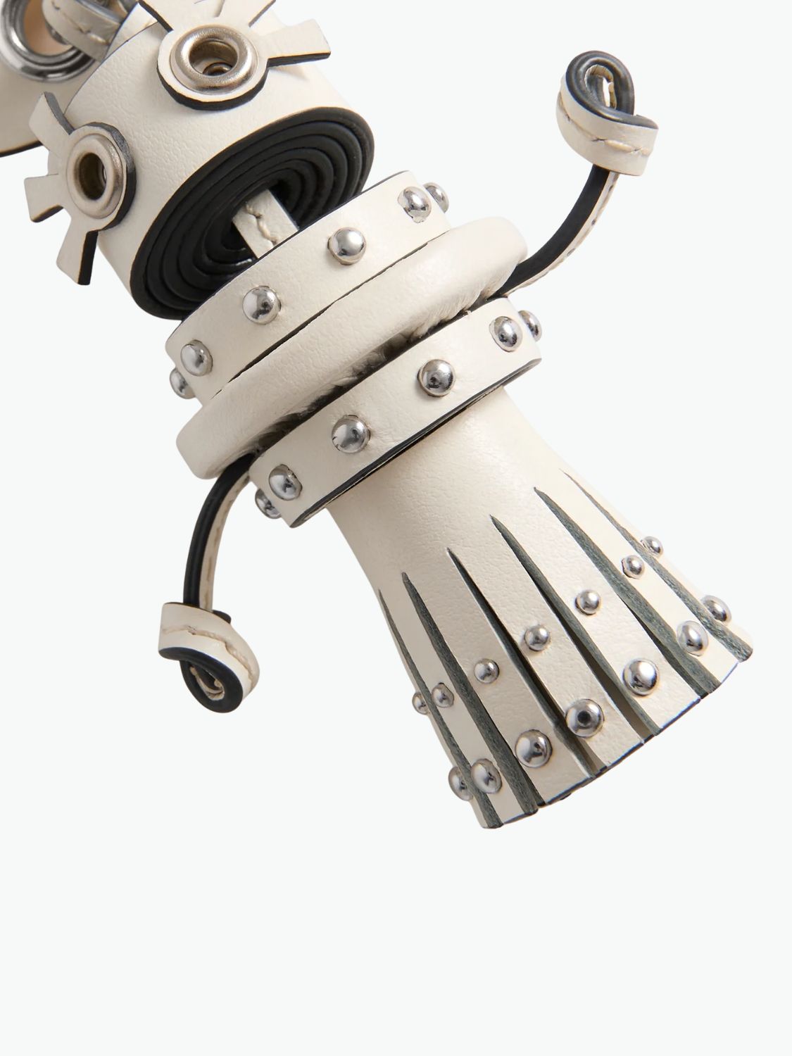 The Anya Hindmarch Bride Charm, crafted in ivory calf leather, is a playful ode to love and craftsmanship. Hand-finished with silver stud detailing, tasselled feet, and an embossed tag, this charming accessory embodies the brand's unique blend of whimsy and sophistication. Its gleaming silver-tone clasp attaches beautifully to any bag or keychain, adding a touch of personality and joy. A delightful keepsake or gift for a bride-to-be, this piece blends British humor with artisanal luxury because even the smallest details deserve to sparkle.