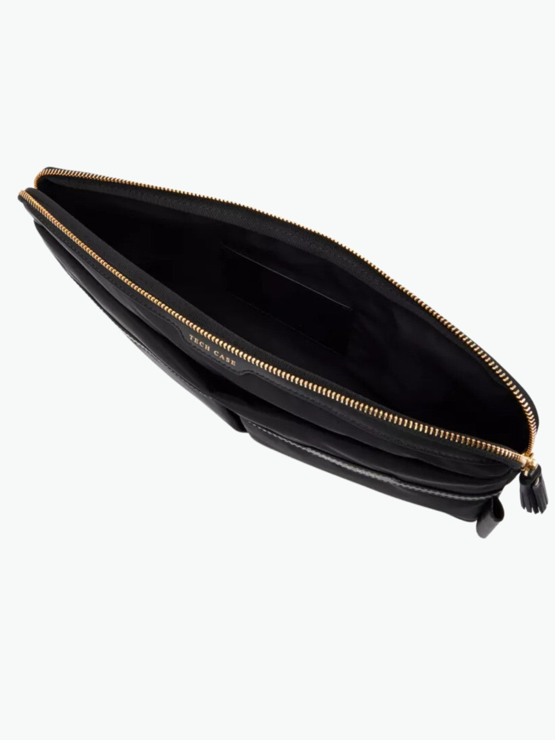 Με την Technology Case της Anya Hindmarch θα είσαι πάντα στυλάτος και οργανωμένος. Το αυστηρό μαύρο χρώμα της με τις χρυσές λεπτομέρειες θα ταιριάξει φανταστικά με όλα τα αξεσουάρ σου. Η κατασκευή της από regenerated nylon, sustainable fabric και δέρμα capra την καθιστά τόσο ελαφριά, στυβαρή και ανθεκτική, ώστε να την έχεις πάντοτε μαζί σου. Χάρις στις πολλαπλές θήκες της θα έχεις πάντα τα πράγματα σου οργανωμένα και εύκολα προσβάσιμα. Ιδανικό δώρο για κάθε λάτρη της τεχνολογίας.