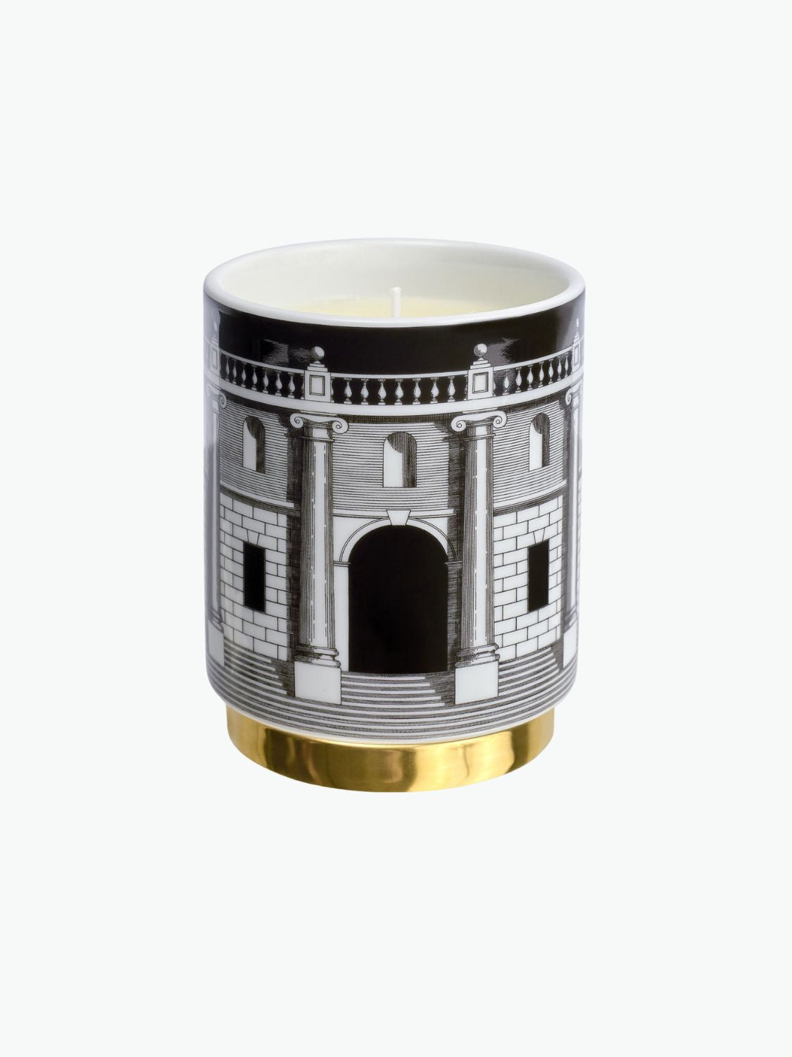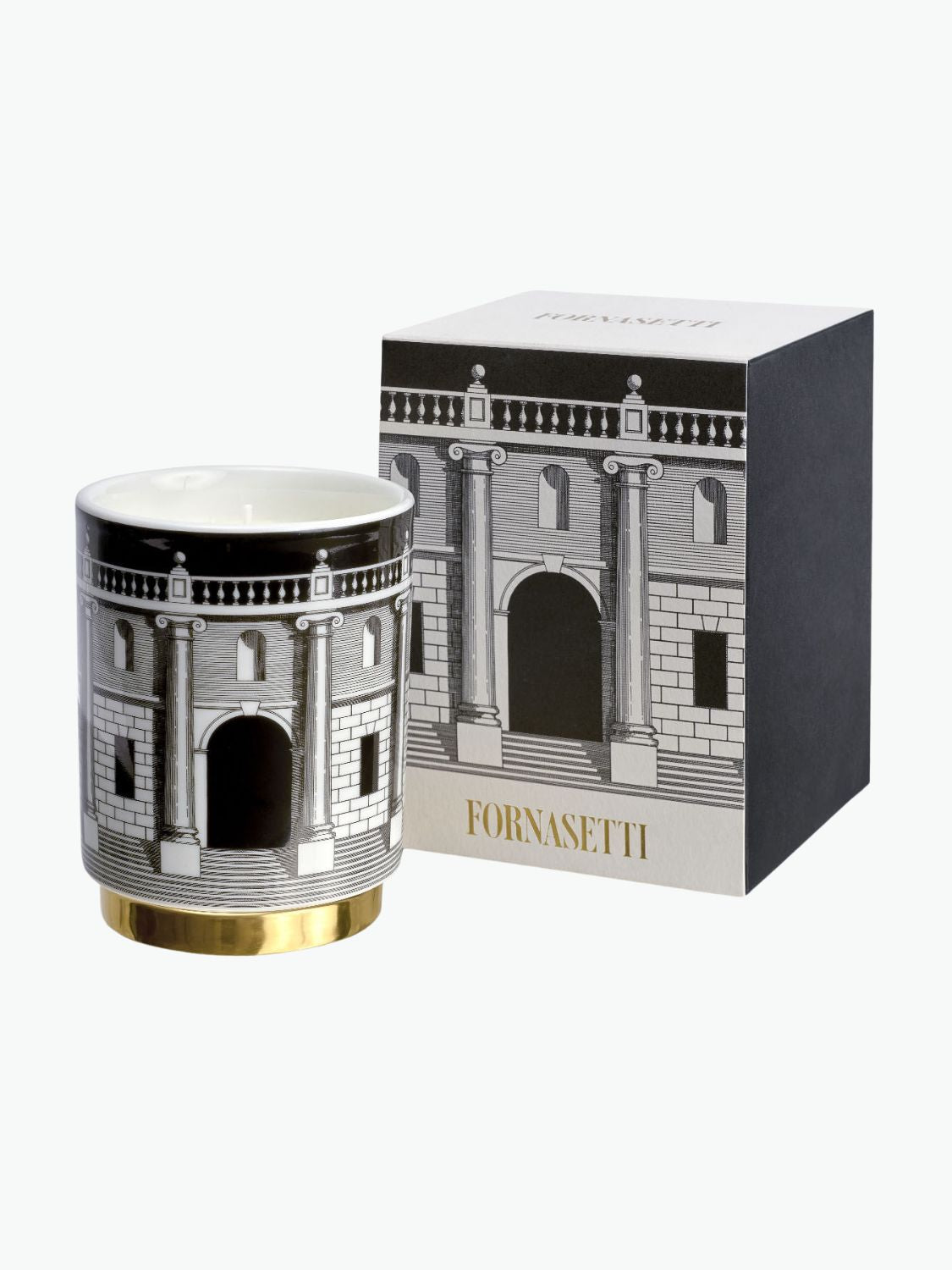 Μια νεοκλασική κιονοστοιχία «αγκαλιάζει» το πορσελάνινο σώμα του κεριού, μεταμορφώνοντας την αρχιτεκτονική του παρελθόντος σε ένα εκλεπτυσμένο διακοσμητικό αντικείμενο. Το κερί είναι διακοσμημένο στο χέρι, με επίχρυσο τελείωμα στη βάση και προσεκτικά ζωγραφισμένο με λεπτομέρεια που τονίζει την τέχνη πίσω απο την κατασκεύη. Το άρωμα Immaginazione αποτυπώνει όλη τη φιλοσοφία του Fornasetti: ξυλώδεις και αρωματικές νότες που αποπνέουν διαχρονική κομψότητα.