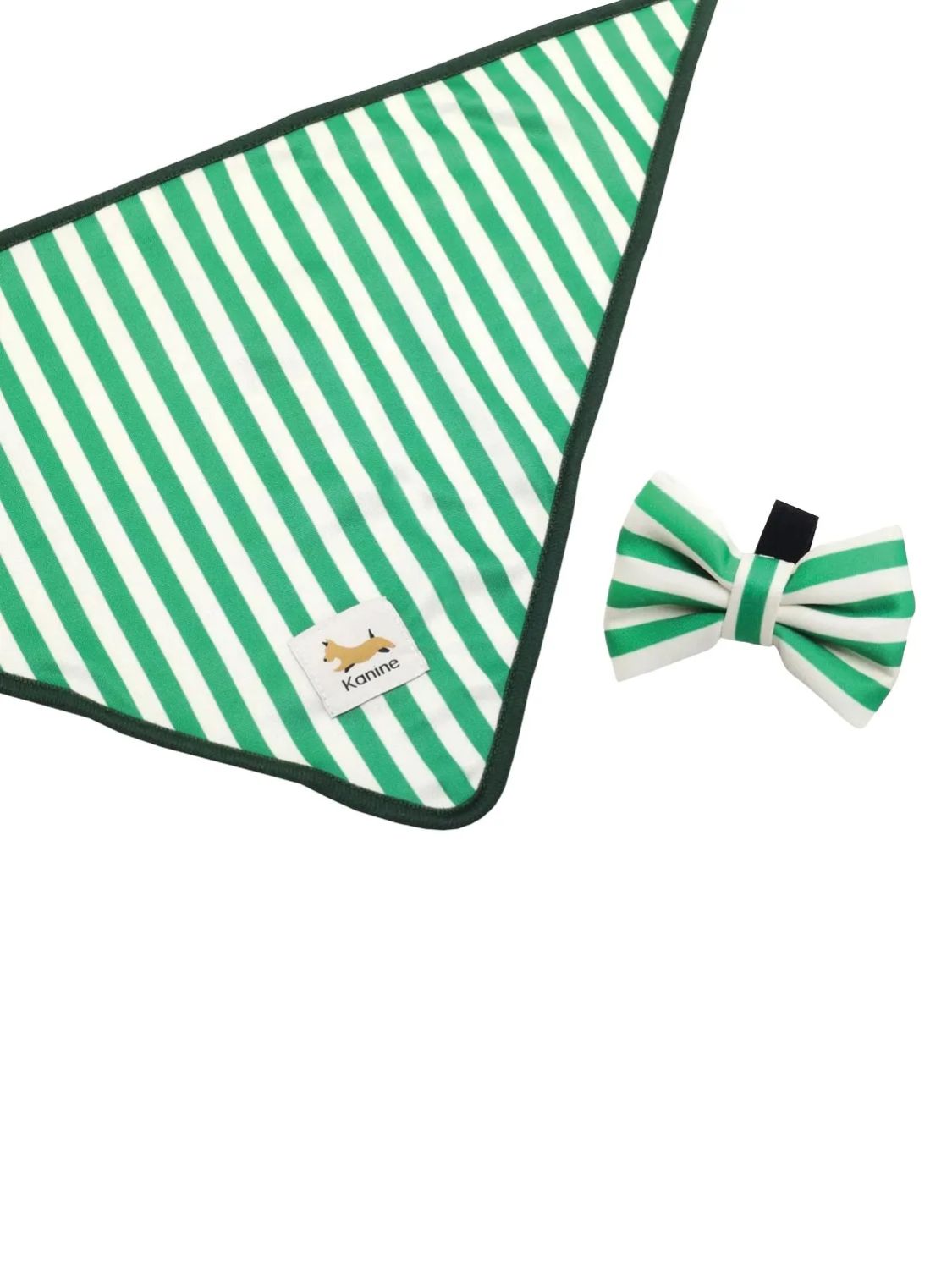 Το Bandana And Bow Set Green της Kanine είναι ένα φανταστικό πολύχρωμα σετ που δεν πρέπει να λείπει από την συλλογή των αξεσουάρ σου. Το fun πράσινο χρώμα του εμπλουτίζεται ευχάριστα με λευκές ρίγες και μαύρες λεπτομέρειες χαρίζοντας του έναν πιο παιχνιδιάρικο και διασκεδαστικό χαρακτήρα. Χάρις στην κατασκευή του από πολυεστέρα είναι πολύ άνετο και ελαφρύ, ώστε να μπορεί το σκυλάκι σου να το φοράει όλη μέρα χωρίς να το κουράζει. Το παπιγιόν κλείνει με κλιπ και η μπαντάνα με απλό δέσιμο για εύκολη και γρήγορη τοποθέτηση.