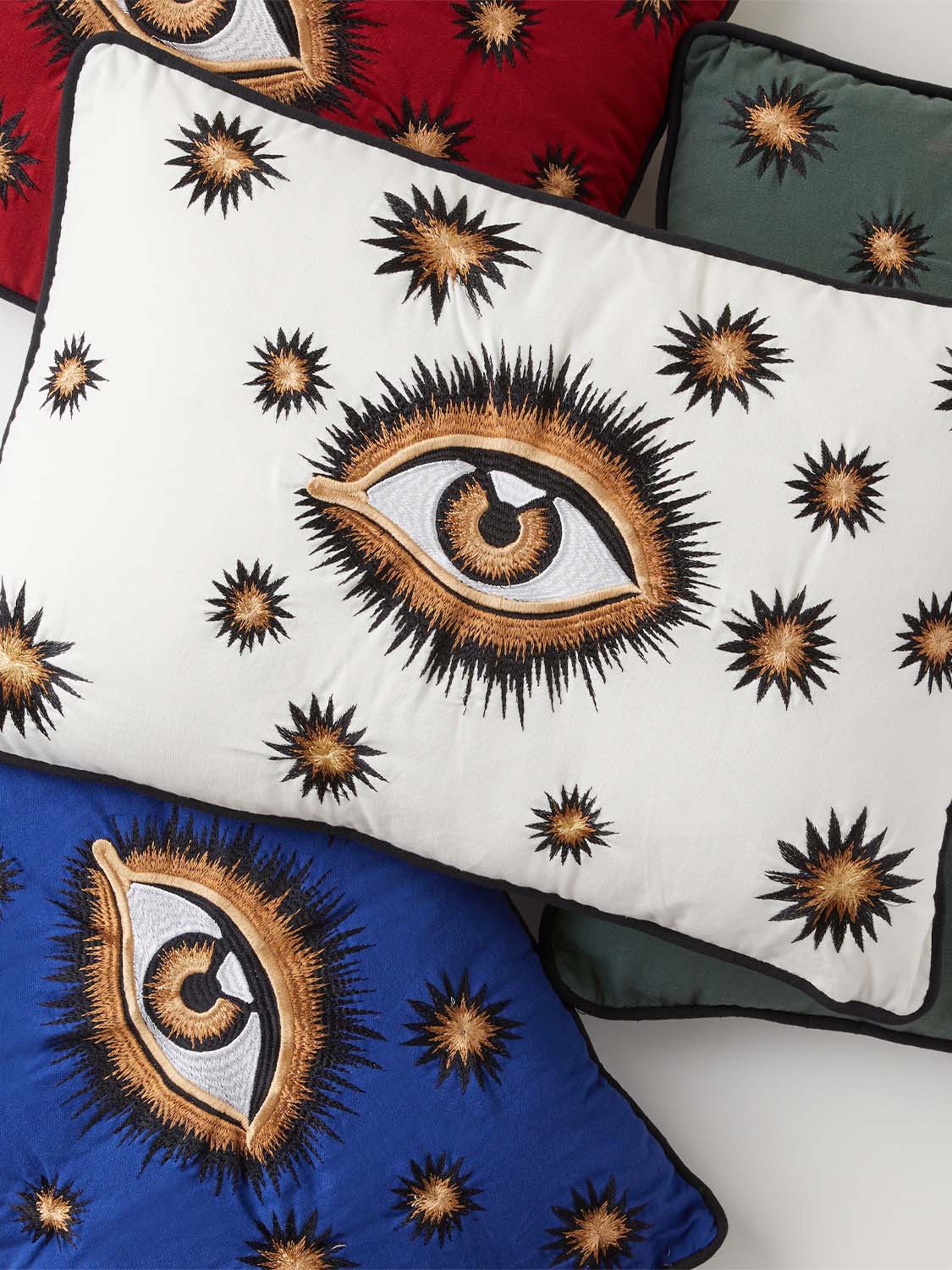 Το Cotton Pillow Cover Eye Rectangular της Les Ottomans θα χαρίσει στο σαλόνι σου λίγη από την πολύχρωμη ομορφιά του. Κατασκευαμένο από βαμβάκι υψηλής ποιότητας είναι ιδιαίτερα άνετο, αναπαυτικό και ανθεκτικό. Το μεγάλο κεντητό μάτι με τις χρυσές, λευκές και μαύρες λεπτομέρειες που κοσμεί το κέντρο του είναι τόσο ζωντανό, όμορφο και επιβλητικό λες και σου προσφέρει απλώχερα τη θεία χάρη και προστασία. Τα χρυσά αστέρια που το περιβάλλουν ενισχύουν ακόμα περισσότερο τη μυστικιστική του αύρα. Ένα πραγματικά τόσο μαγευτικό κομμάτι δεν πρέπει να λείπει από κανένα σαλόνι. Αν θες να αποκτήσεις το ολοκληρωμένο σετ συνδύασε τον με το αντίστοιχο σετ ποτηριών.
