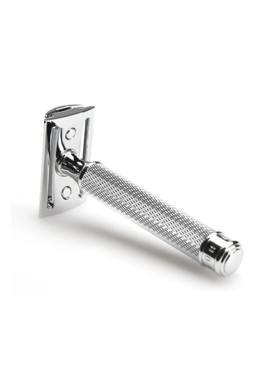 Για γενιές, το ξυράφι ασφαλείας θεωρείται ως ένα κομψό κλασικό που μπορεί ακόμη και να ξυρίσει τις άκρες με ακρίβεια. Για πολλούς είναι το κατ’ εξοχήν ξυράφι. Το στυλ του ταιριάζει ιδανικά στο σχεδιασμό των προϊόντων Muhle. Ακόμα κι αν η ανοιχτή λεπίδα απαιτεί λίγο σεβασμό στην αρχή: Μετά από μια σύντομη περίοδο εξοικείωσης και καθοδηγούμενη από ένα σταθερό χέρι, παράγει ένα πολύ στενό ξύρισμα και ένα αποτέλεσμα που διαρκεί. Σε αντίθεση με τα σύγχρονα συστήματα λεπίδων, η κεφαλή του ξυραφιού ασφαλείας δεν κινείται. Οι λεπίδες αντικαθίστανται ξεβιδώνοντας το καπάκι.