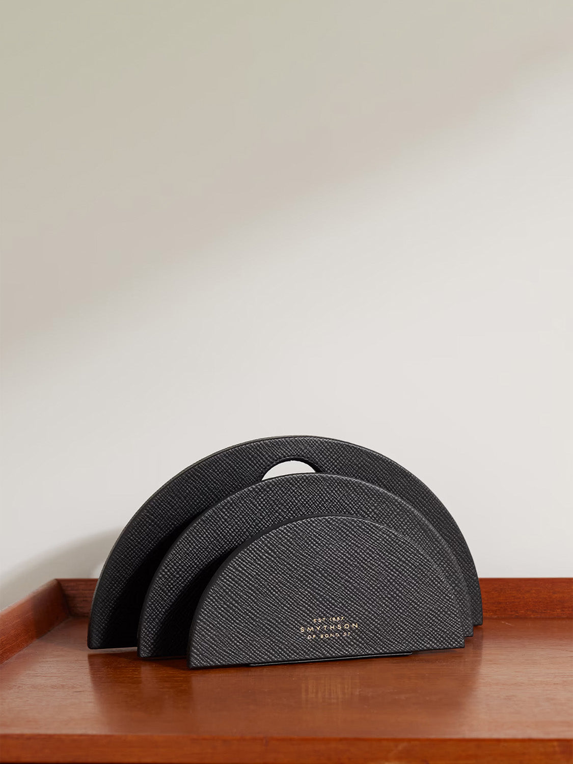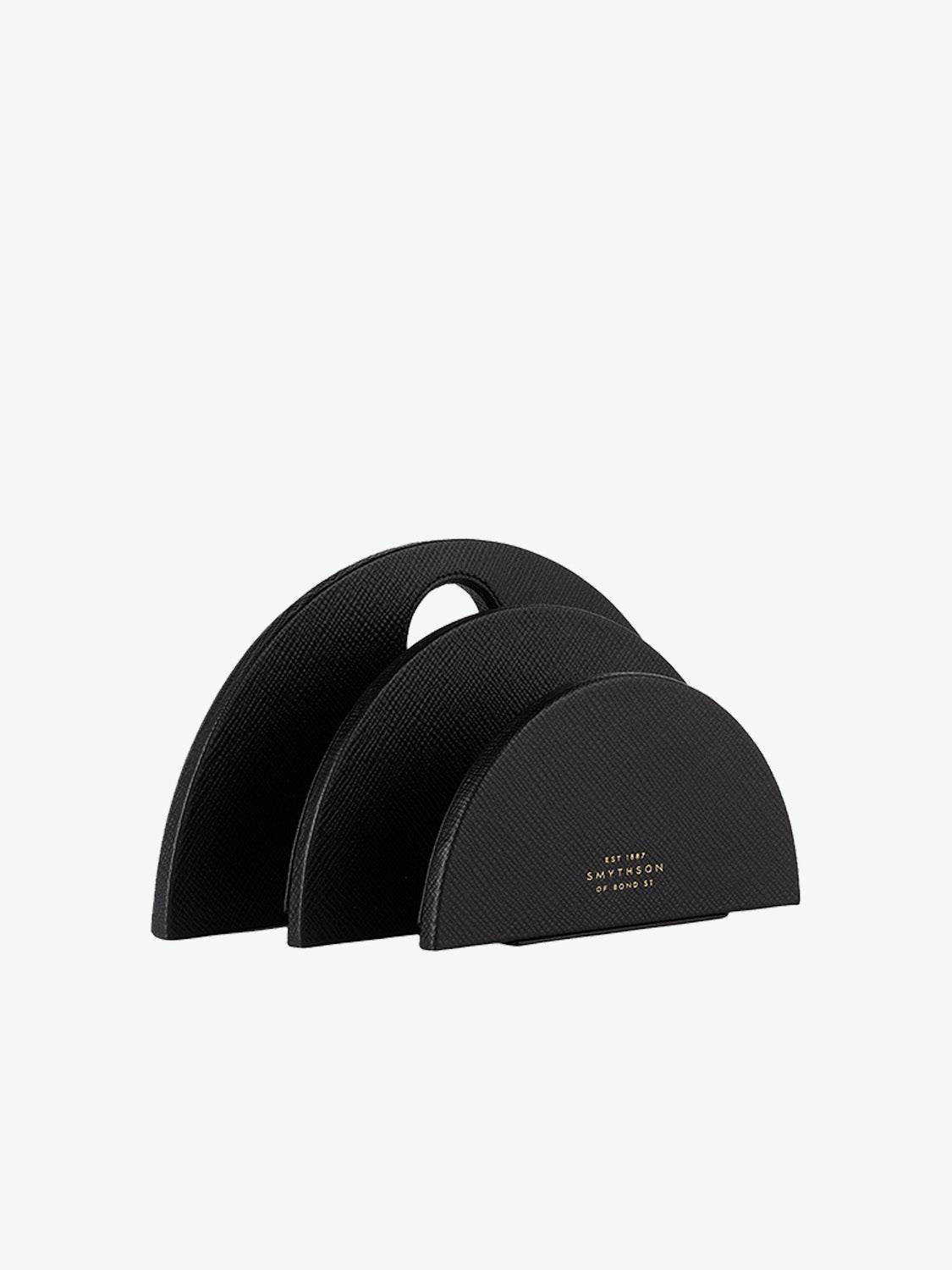 Η Panama Circular Letter Rack Black της Smythson θα σε βοηθήσει να έχεις πάντοτε μαζεμένο και τακτοποιημένο το γραφείο και τις επιστολές σου. Όντας κατασκευασμένη από το ξακουστό δέρμα Panama της Smythson με σταυρωτή υφή είναι ιδιαίτερα ανθεκτική, ευχάριστη στην αφή και όμορφη στην όψη. Παράλληλα, ο καμπυλωτός σχεδιασμός της και το κομψό μαύρο χρώμα της θα ταιριάξουν φανταστικά με την διακόσμηση του γραφείου σου. Η θήκη περιλαμβάνει δύο ξεχωριστές θήκες αποθήκευσης εγγράφων.