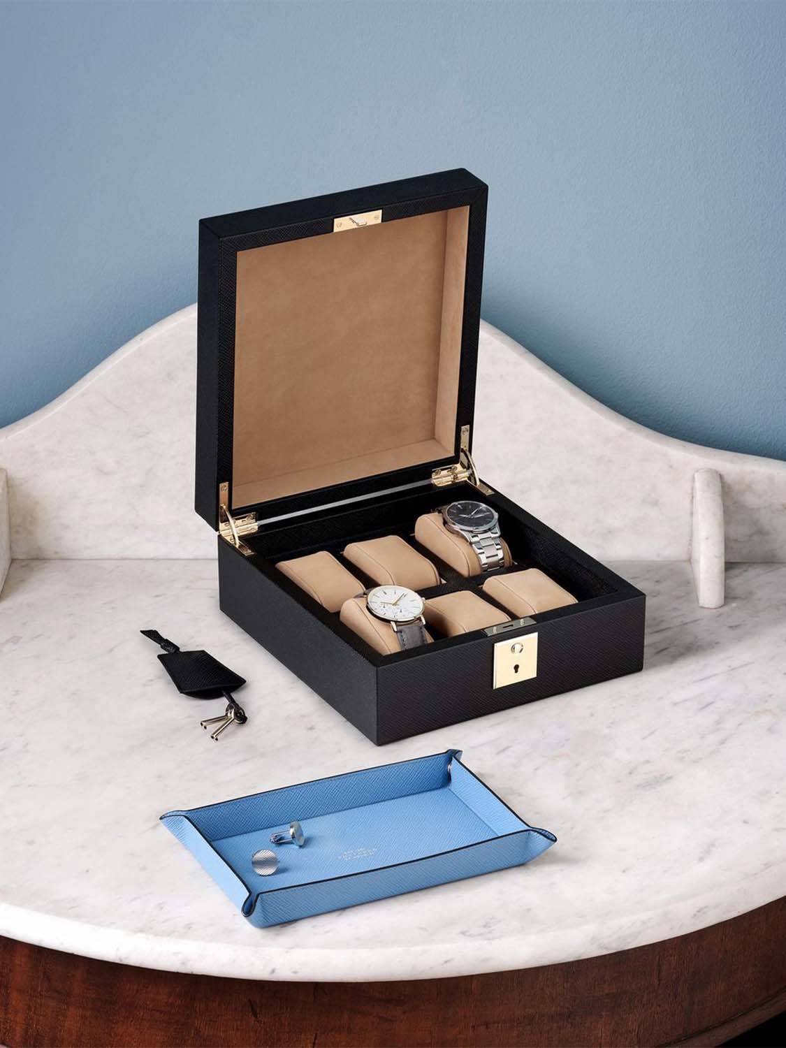 Είτε ταξιδεύετε για αναψυχή είτε για δουλειά, το να έχετε περισσότερες από μία επιλογές ρολογιών είναι must. Το κομψό και ανθεκτικό κουτί ρολογιών με κλείδωμα της Smythson, κατασκευασμένο από ανάγλυφο δέρμα cross-grain, μπορεί να φιλοξενήσει μέχρι έξι ρολόγια με ασφάλεια. Η απαλή επένδυση από nubuck προστατεύει κάθε αγαπημένο σας κομμάτι, ενώ ο συμπαγής σχεδιασμός του το καθιστά ιδανικό για να χωρέσει εύκολα στη χειραποσκευή σας.