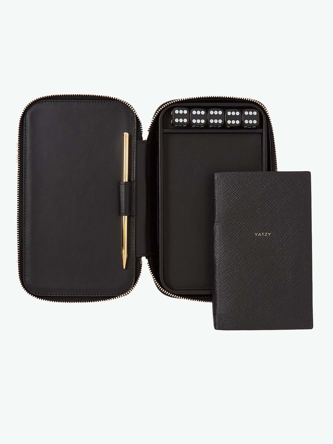 Με το Panama Yatzy Game Set Black της Smythson οι ατελειώτες ώρες αναμονής στα ταξίδια σου θα περάσουν σαν νερό. Το σετ περιλαμβάνει 5 ζάρια, ένα gilt μολύβι, ένα βιβλίο με κανόνες και για καταγραφή σκορ και μια θήκη αποθήκευσης, ώστε να έχεις πάντοτε μαζί σου συγκεντρωμένα και τακτοποιημένα όλα όσα χρειάζεσαι. Το δέσιμο του με φυσικό δέρμα Panama και η διασταυρωτή υφή του το καθιστούν ιδιαίτερα ευχάριστο, άνετο και ελαφρύ στο χέρι. Το αυστηρό μαύρο χρώμα του με τις χρυσές λεπτομέρειες θα ταιριάξει φανταστικά με τα υπόλοιπα αξεσουάρ σου. Τι περιμένεις λοιπόν; Άνοιξε την κασετίνα και ξεκίνα το παιχνίδι!